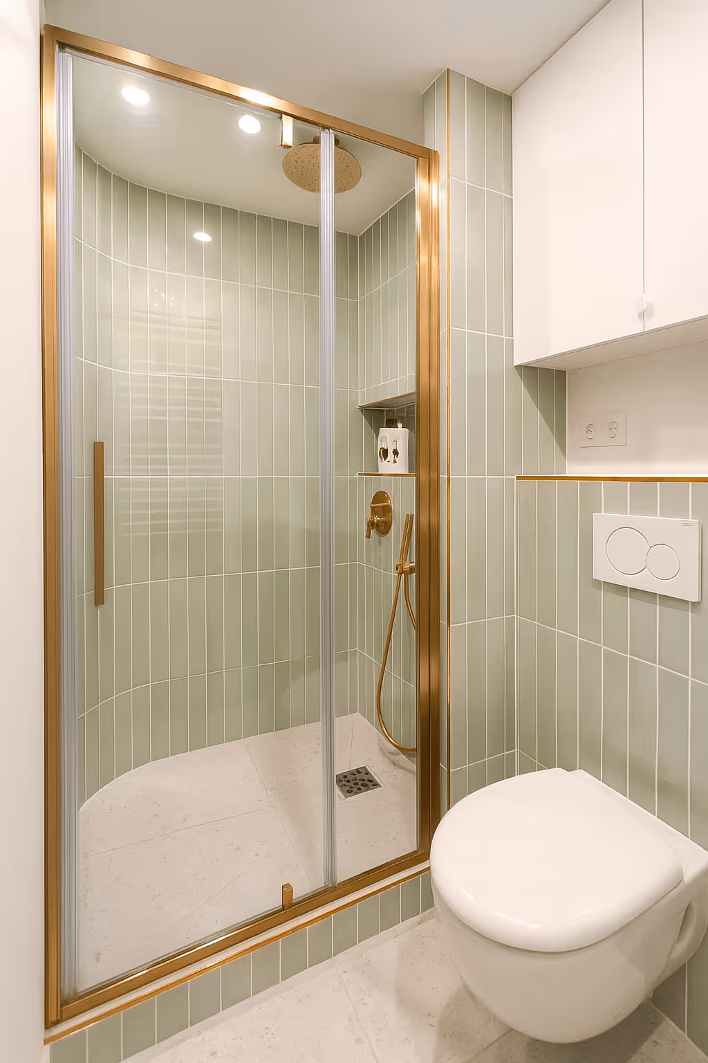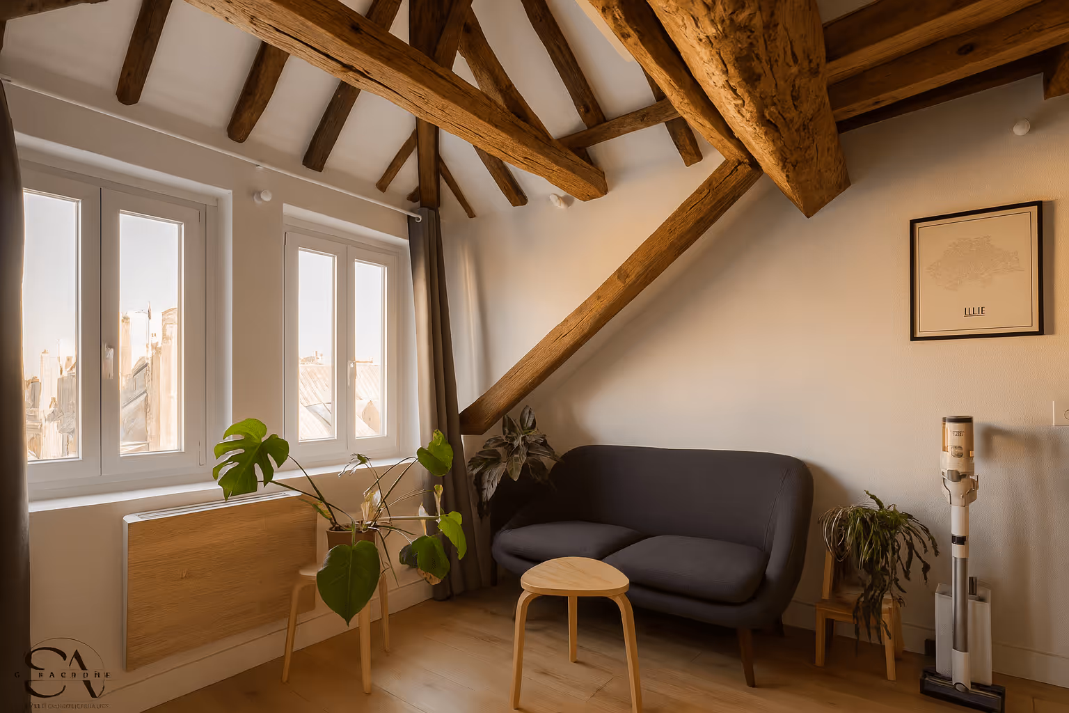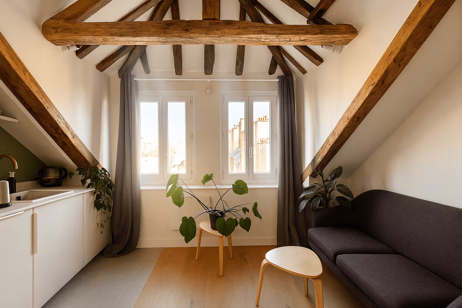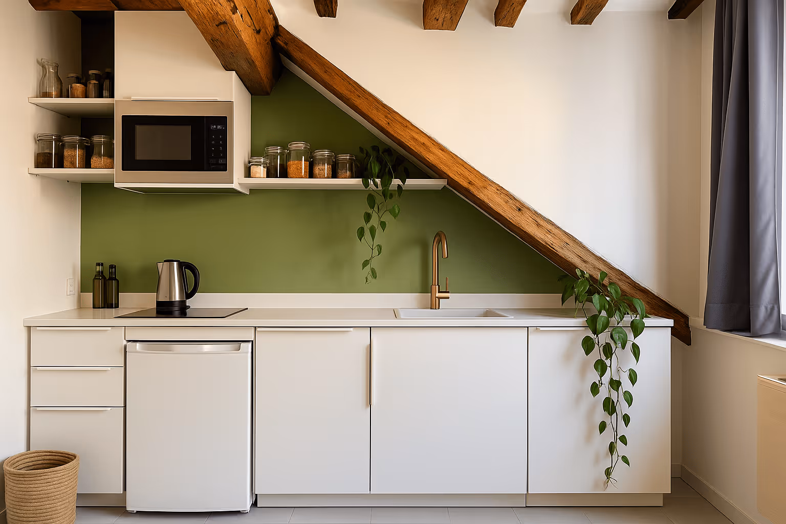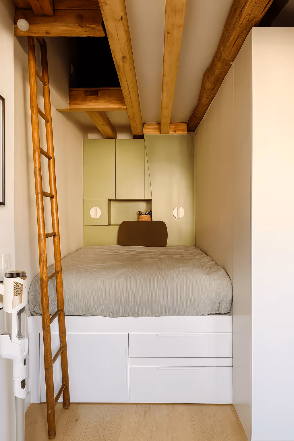 Le projet s’est concentré sur la création d’un maximum d’espace et de confort dans une petite surface : un coin séjour chaleureux, une cuisine fonctionnelle et parfaitement intégrée, ainsi qu’une salle de bain repensée pour offrir un confort optimal malgré la contrainte de surface.