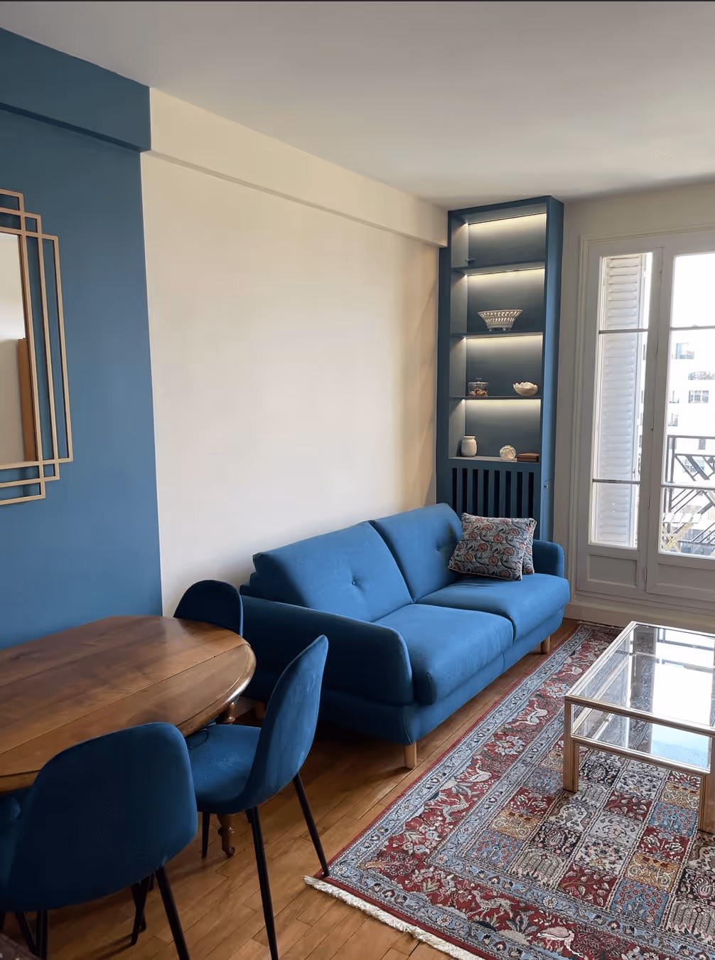 L’intervention a permis de repenser complètement l’agencement, en transformant le placard de l’entrée en coin nuit discret, en intégrant un plan de travail optimisé dans la cuisine, et en créant plusieurs solutions de rangement sur mesure. Une banquette sur mesure a également été conçue, se transformant ingénieusement en lit superposé escamotable, afin d’accueillir confortablement des invités sans compromettre l’espace de vie.