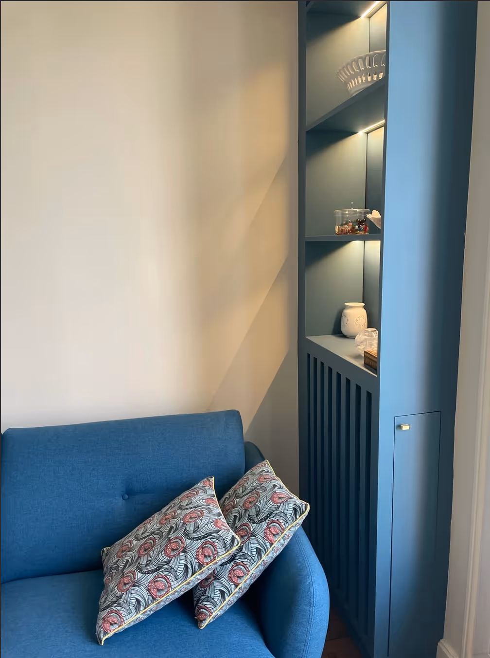 Les toilettes ont été rénovées pour gagner en confort et fonctionnalité, avec l’ajout d’un lave-main, d’un meuble de rangement et d’un nouveau châssis de fenêtre. Un soin particulier a été porté au salon avec la création d’un cache-radiateur et d’une petite bibliothèque, tout en conservant une harmonie avec les volumes existants.