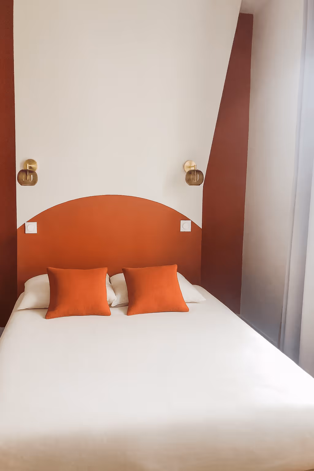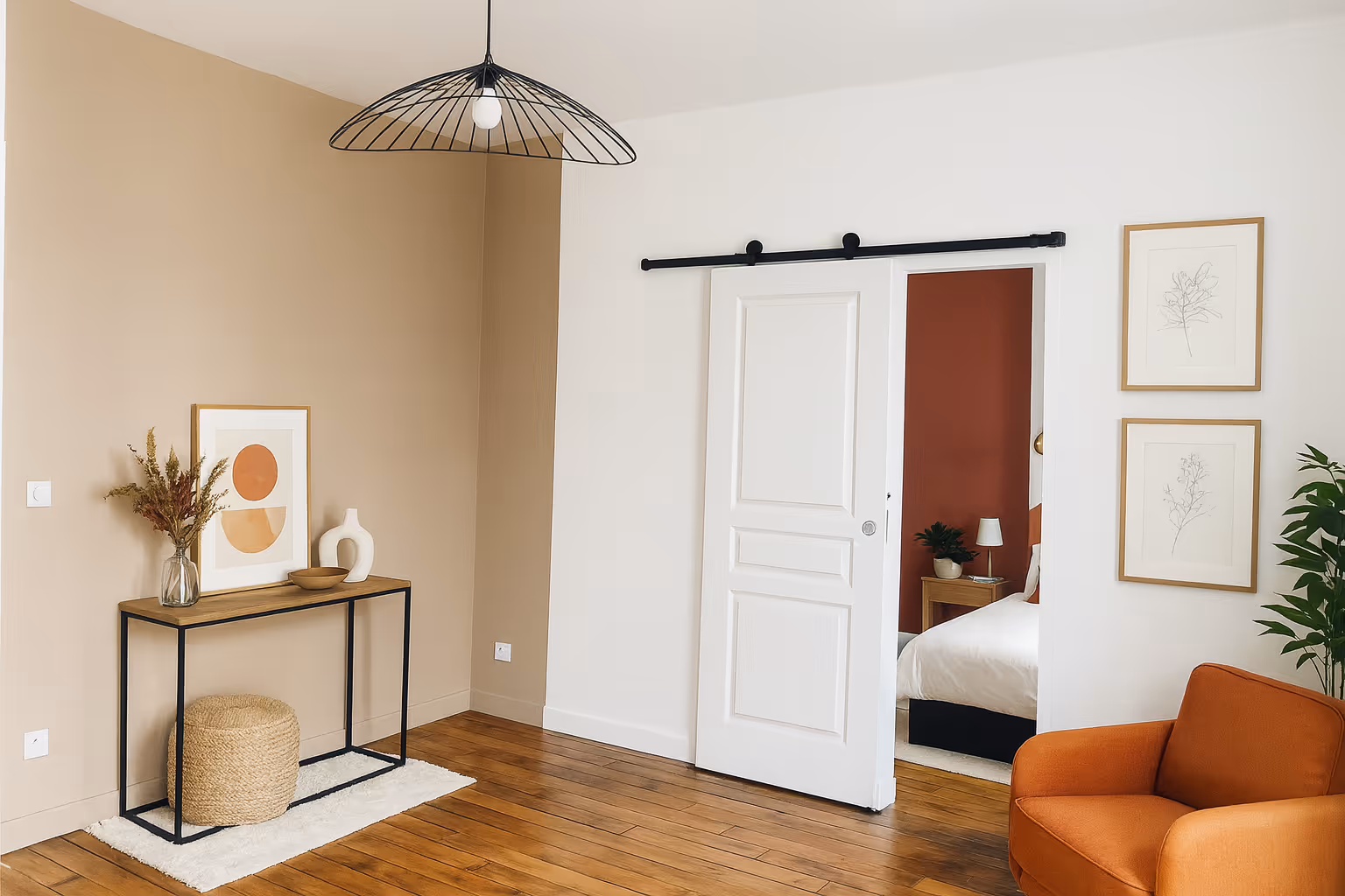 Dans le séjour, l’ambiance se veut douce et lumineuse : teintes vert amande, biscuit, ocre, mobilier aux lignes épurées et éclairage soigné. La chambre s’habille de tons plus profonds (terracotta, argile rouge, cordoue), pour créer un univers chaleureux, intime et personnalisé.
