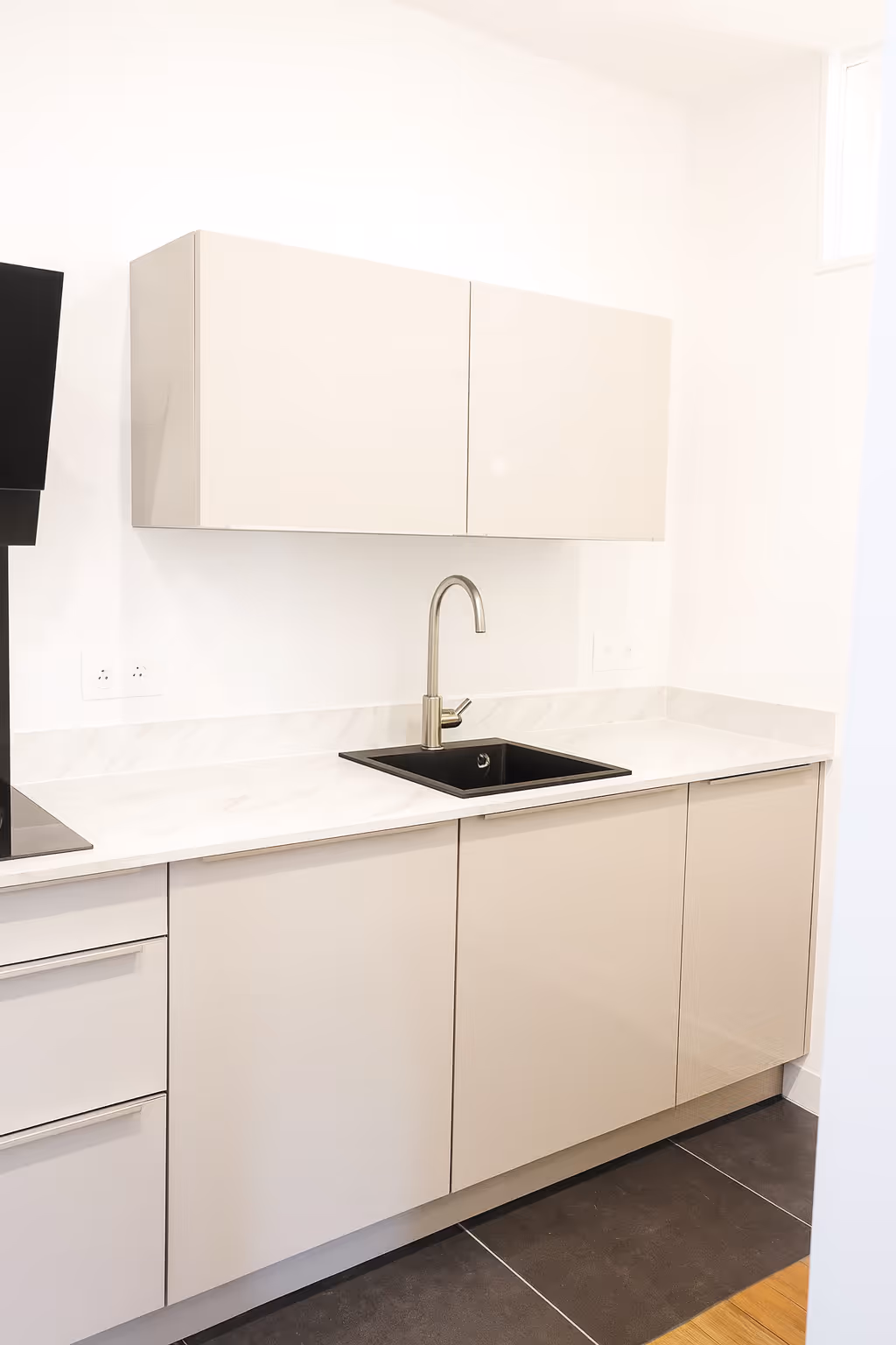 L’intervention a débuté par un réaménagement total des pièces. L’ancienne cuisine a été transformée en salle d’eau, tandis que la nouvelle cuisine a été déplacée à l’entrée de l’appartement. Cette décision stratégique a permis d’ouvrir l’espace de vie, d’optimiser les volumes et d’améliorer la circulation.