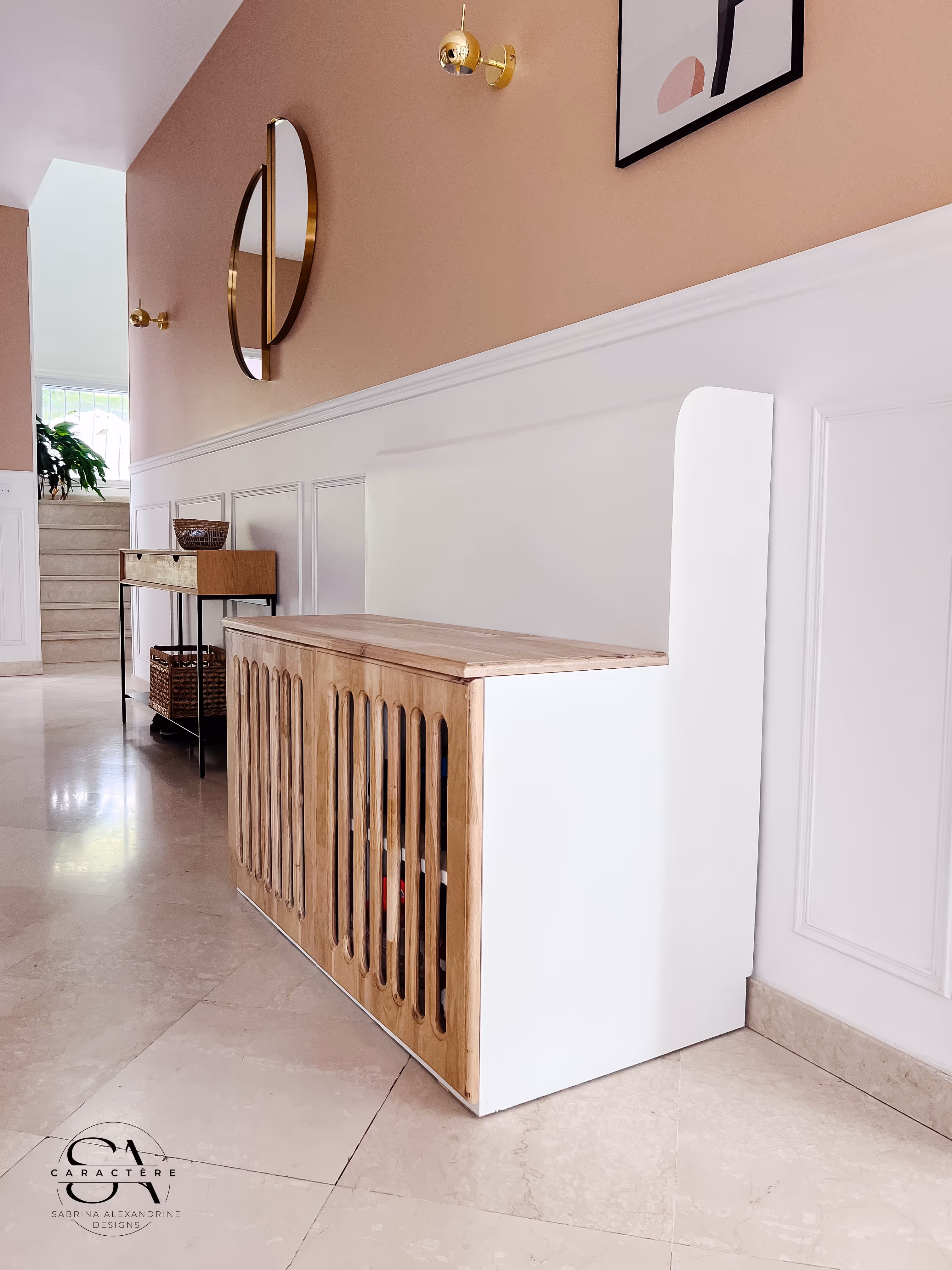 Sur mesure, des bibliothèques et cache-radiateurs ont été dessinés, accompagnés d’un espace bureau intégré, favorisant à la fois confort et fonctionnalité. L’ensemble propose un équilibre subtil entre minimalisme apaisant et caractère affirmé, à l’image des deux atmosphères complémentaires de la maison.