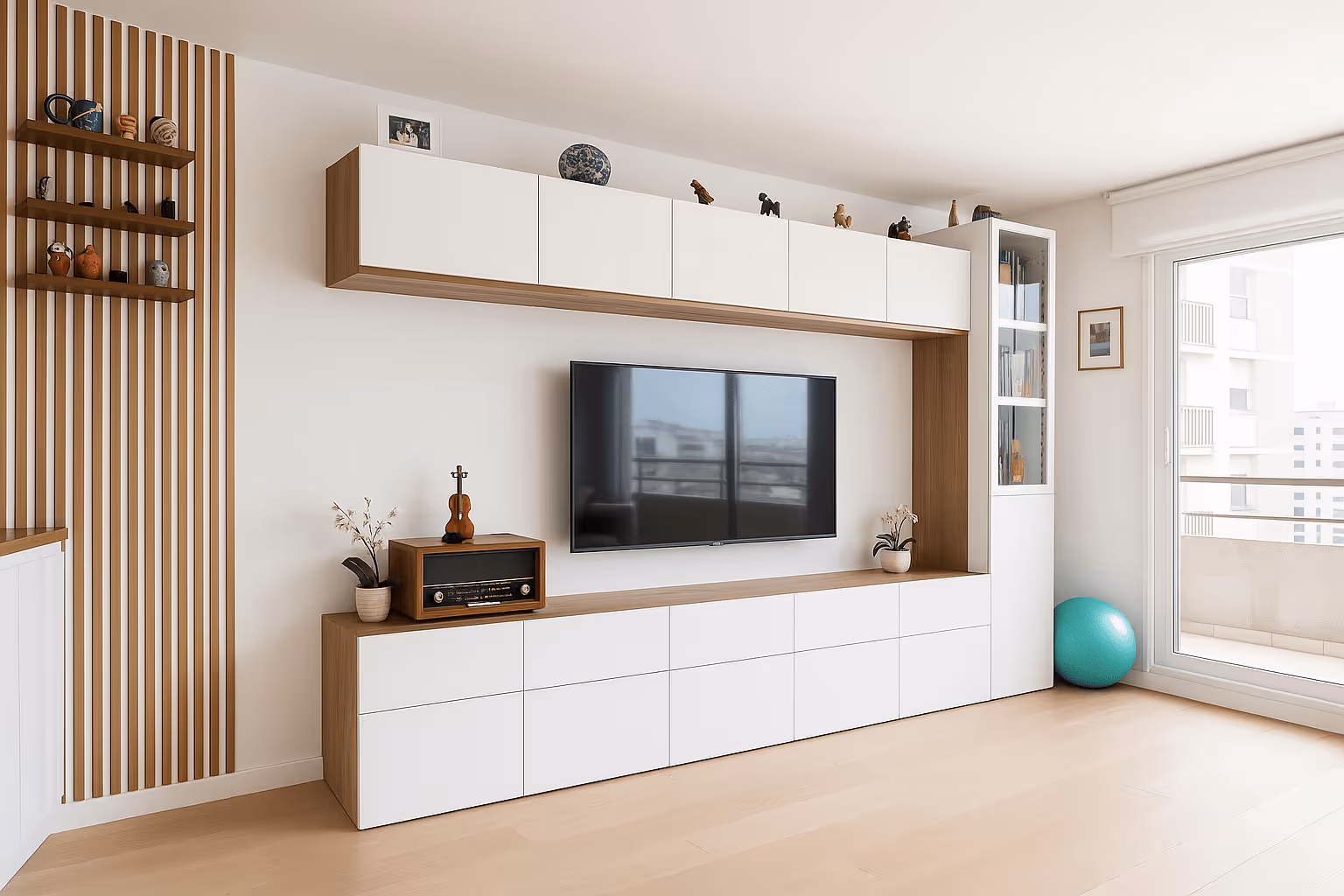 L’objectif principal du projet était de structurer l’espace en intégrant des rangements sur mesure, de revoir entièrement l’éclairage pour créer une atmosphère chaleureuse, et d’optimiser les fonctions de chaque zone : séjour, coin nuit, cuisine et salle d’eau.